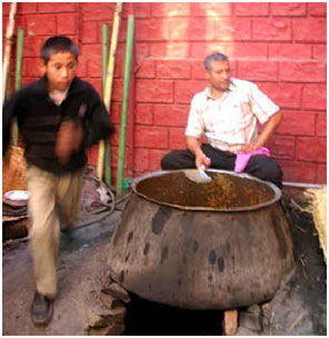 Основной медный казан наполняется почти до самого верха водой и под ним разжигается огонь. Как только вода закипит, в него бросают тщательно промытый рис. Рис промывается не менее 3-х раз. Для его промывки используют обычные корыта.